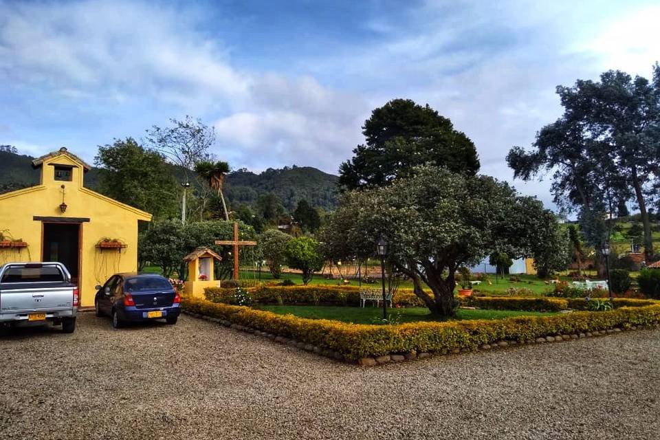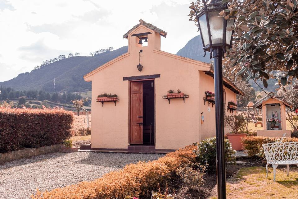 Su hermosa y elegante capilla es el lugar soñado para su ceremonia. Su conjunto arquitectónico evoca los más bellos sentimientos, creando un ambiente cálido y acogedor para su gran día. Sus inmediaciones son el escenario perfecto para dejar para la posteridad estupendas fotografías de su unión, ya que su paisaje natural de colinas y verdes campos rodean la hacienda.